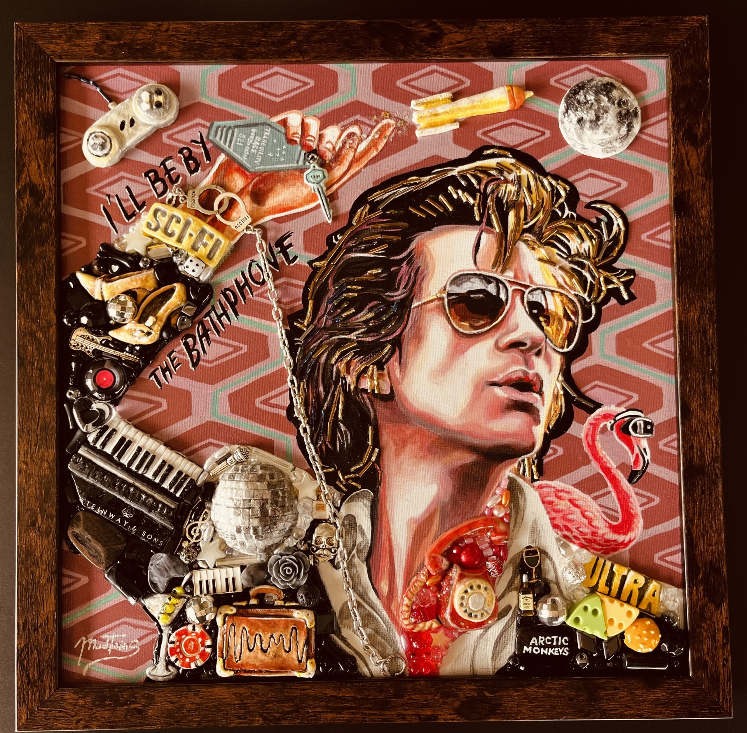 Original art by Olya and Vera MadTwins: Acrylic, beads, polymer clay on canvas, measuring 12×12″ with custom handmade frame