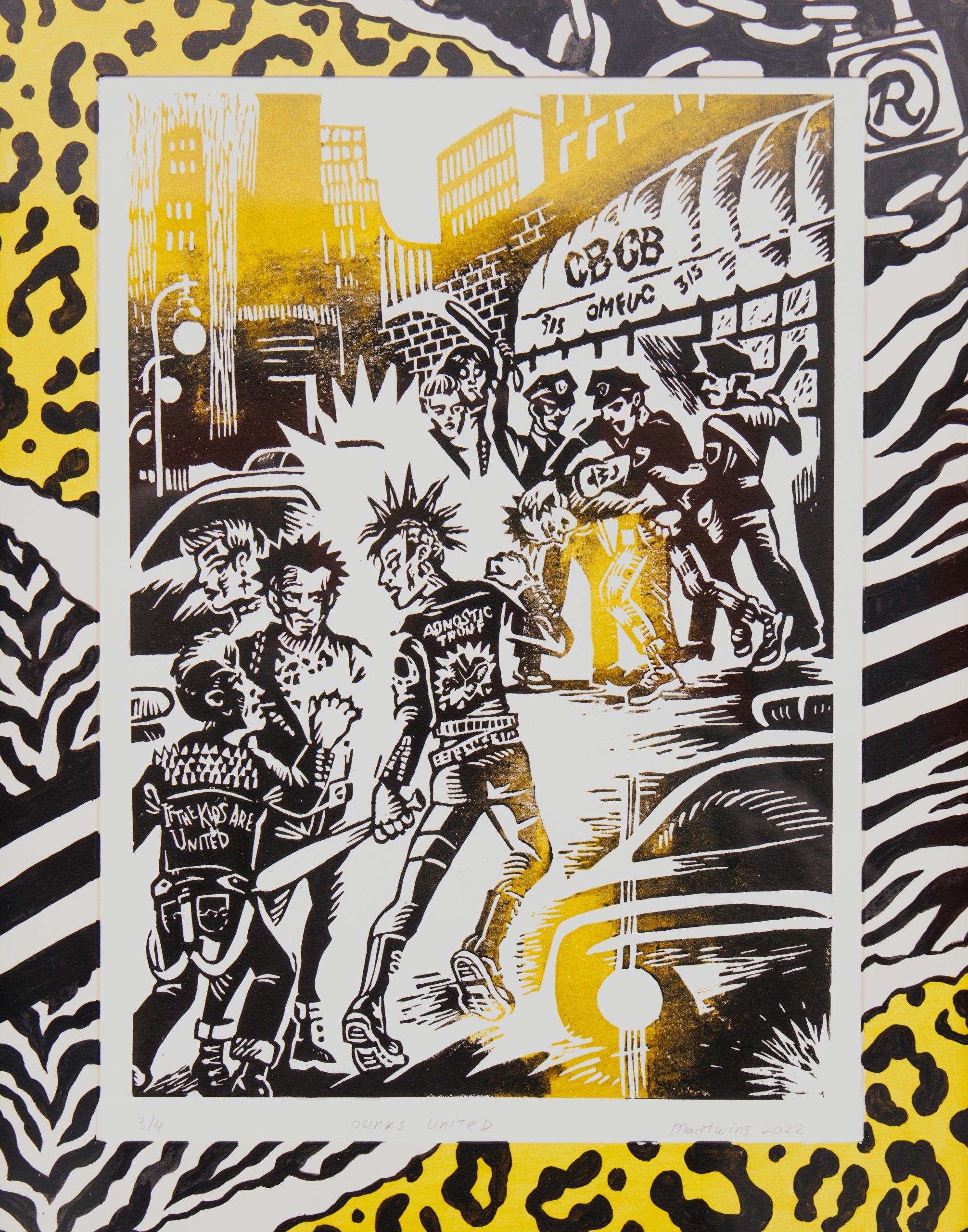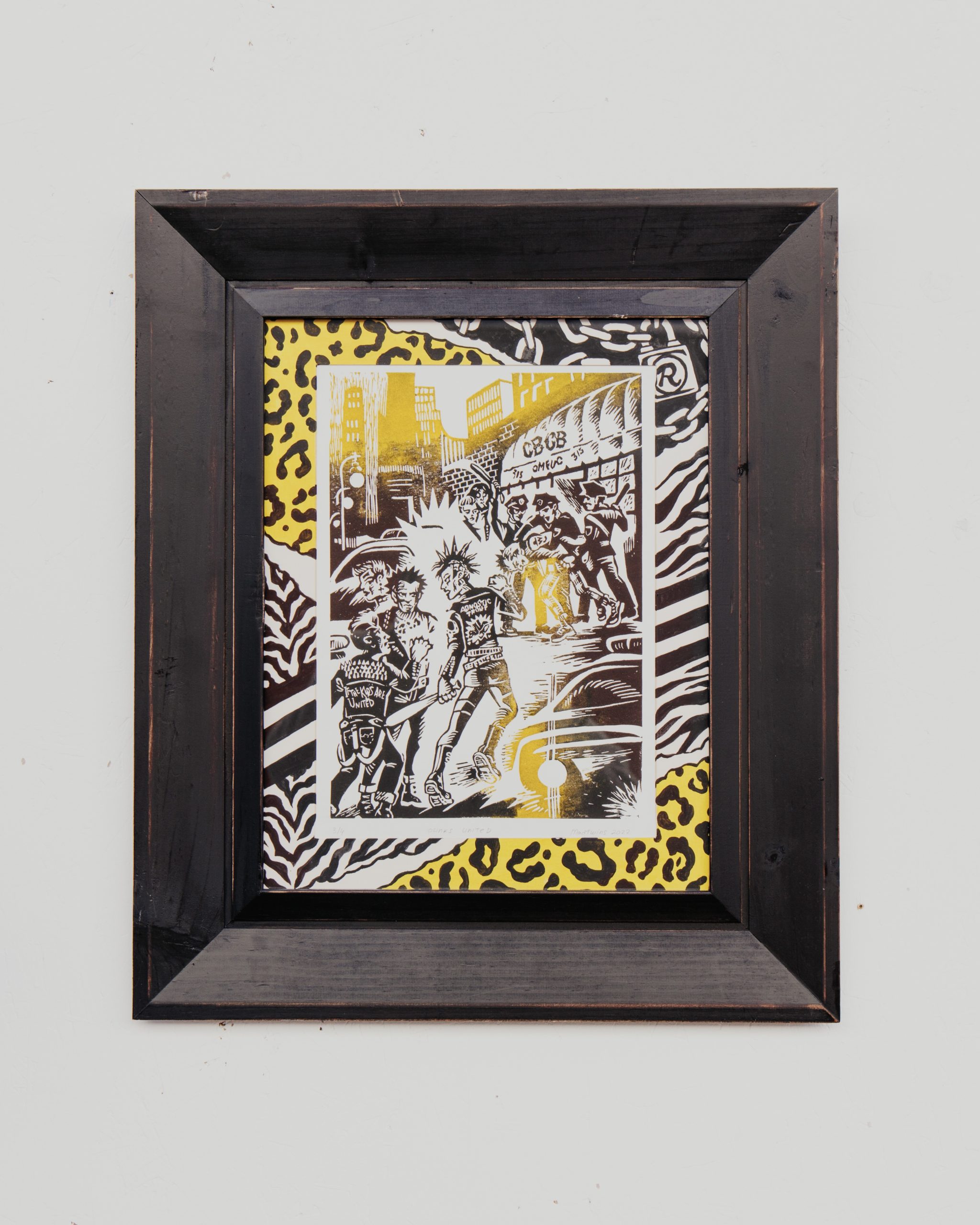 This is a lino print with custom, handmade, 1-of-1 mat and frame. Art piece measures 11×14″