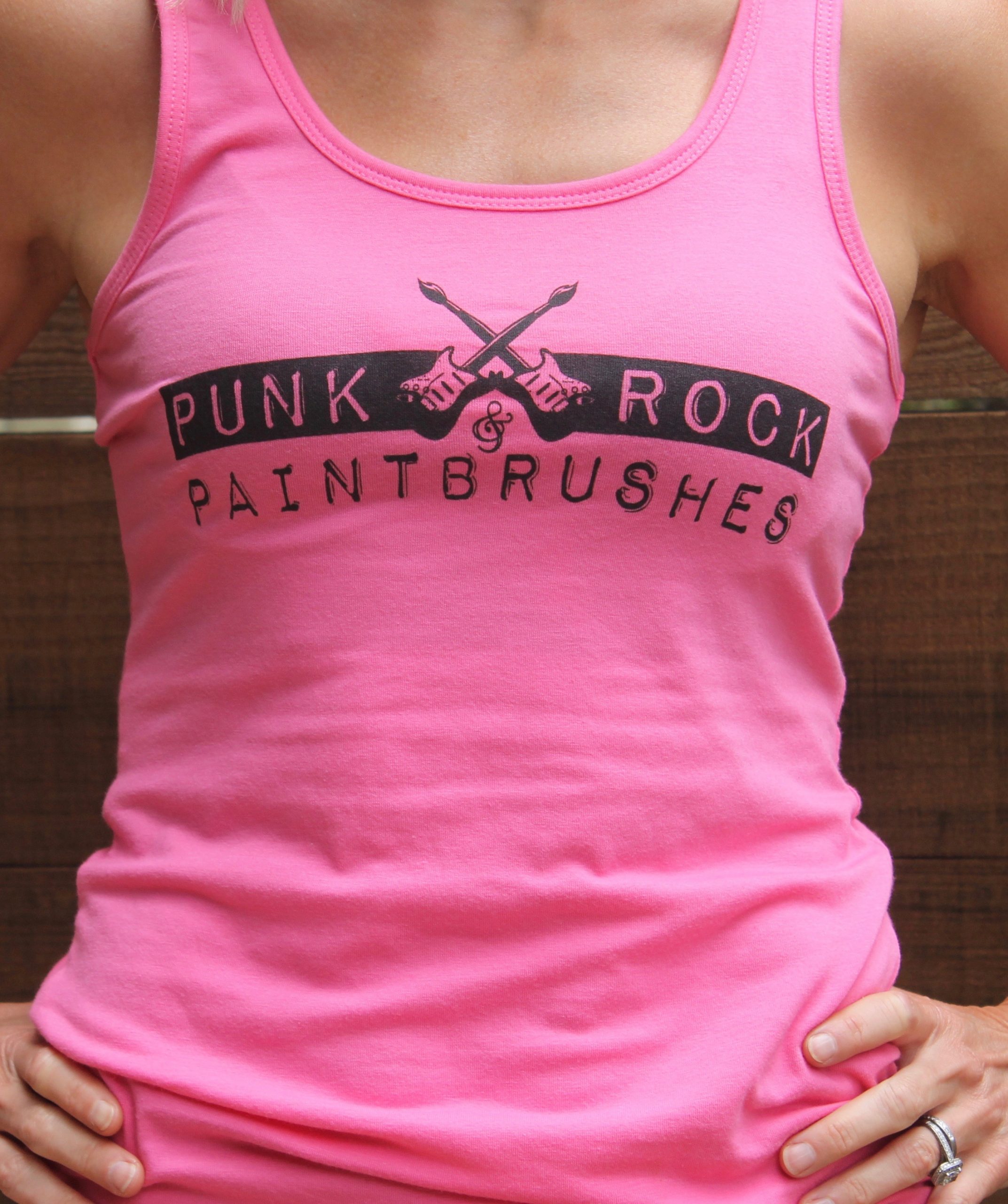 The classic “PUNK ROCK & PAINTBRUSHES” black logo on this very comfortable cotton stretch Next Level ladies’ fit pink tank.