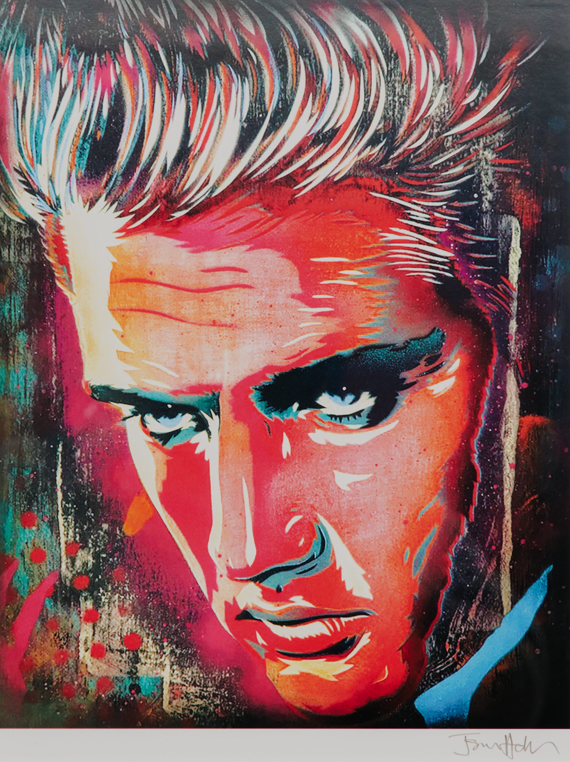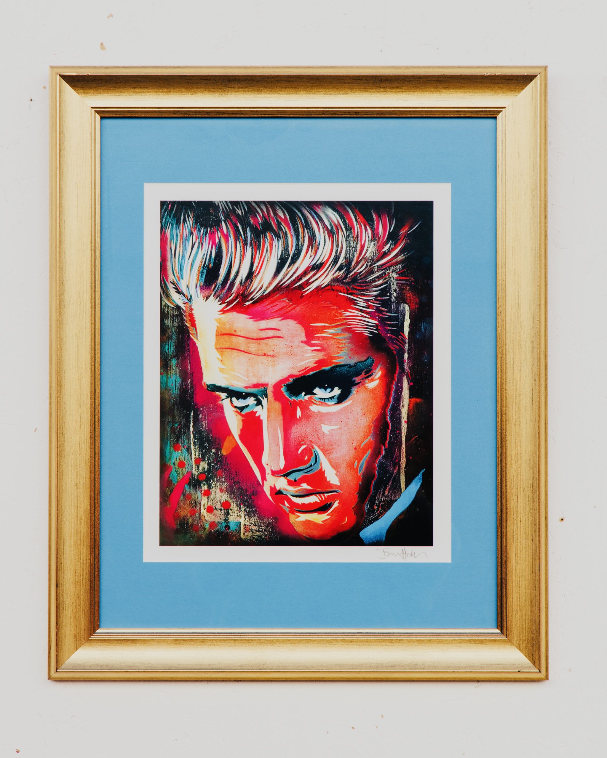 Giclee print signed by artist from the original art which is layered stencil created with acrylic and spray on wood panel. This print has a custom blue mat with golden shimmer frame.