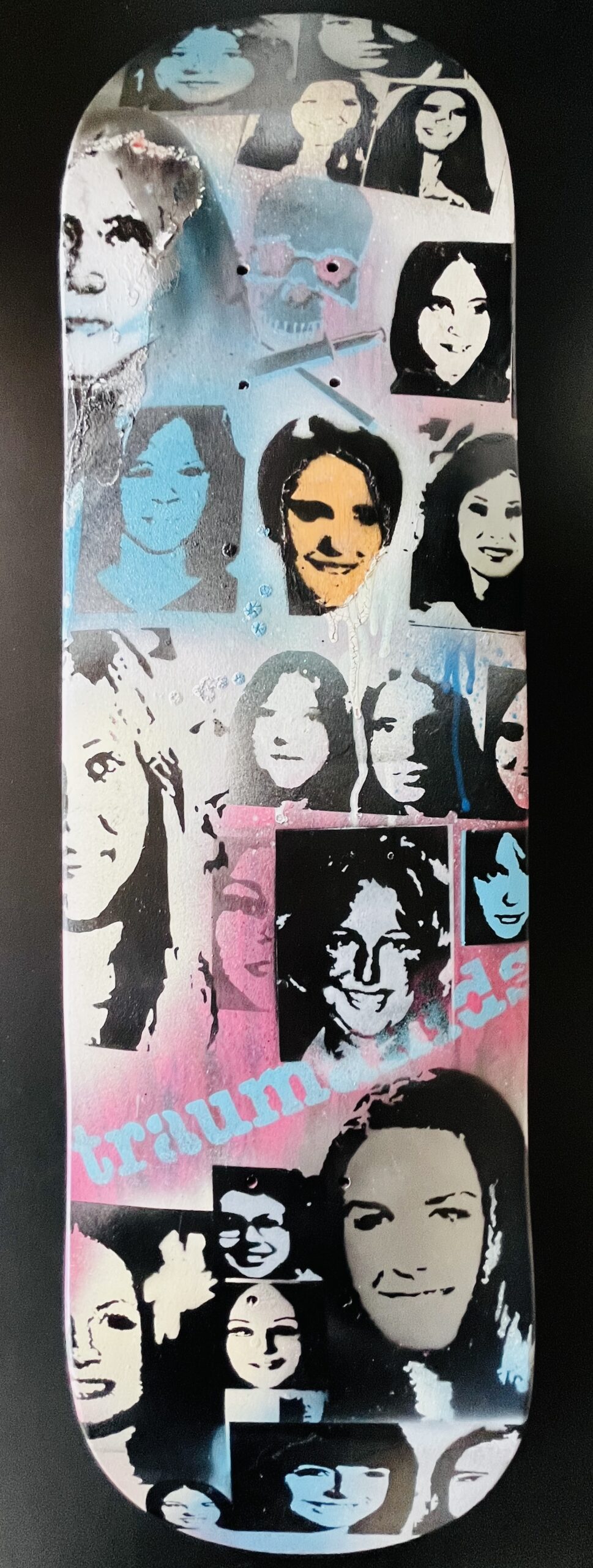 Original art painted by Dave Navarro, created by mixed media: stencil & acrylic on skate deck.
